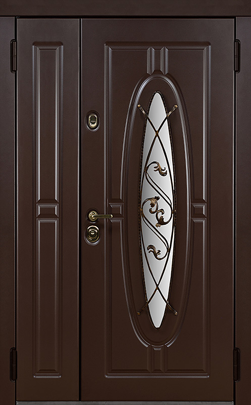 Двойная уличная дверь с овальным стеклом и художественной ковкой №14 — это уникальное сочетание функциональности и эстетики. Панели МДФ с ПВХ-покрытием, используемые как для внешней, так и для внутренней отделки, обладают высокой стойкостью к внешним воздействиям, сохраняя свой внешний вид на долгие годы. Внешний декор в виде художественной ковки придаёт двери особый шарм, подчеркивая её стиль и индивидуальность. Двойная уличная дверь с овальным стеклом и художественной ковкой №14 от производителя: быстрое изготовление и монтаж в Химках, индивидуальные размеры, широкий выбор материалов и фурнитуры, официальная гарантия до 10 лет.