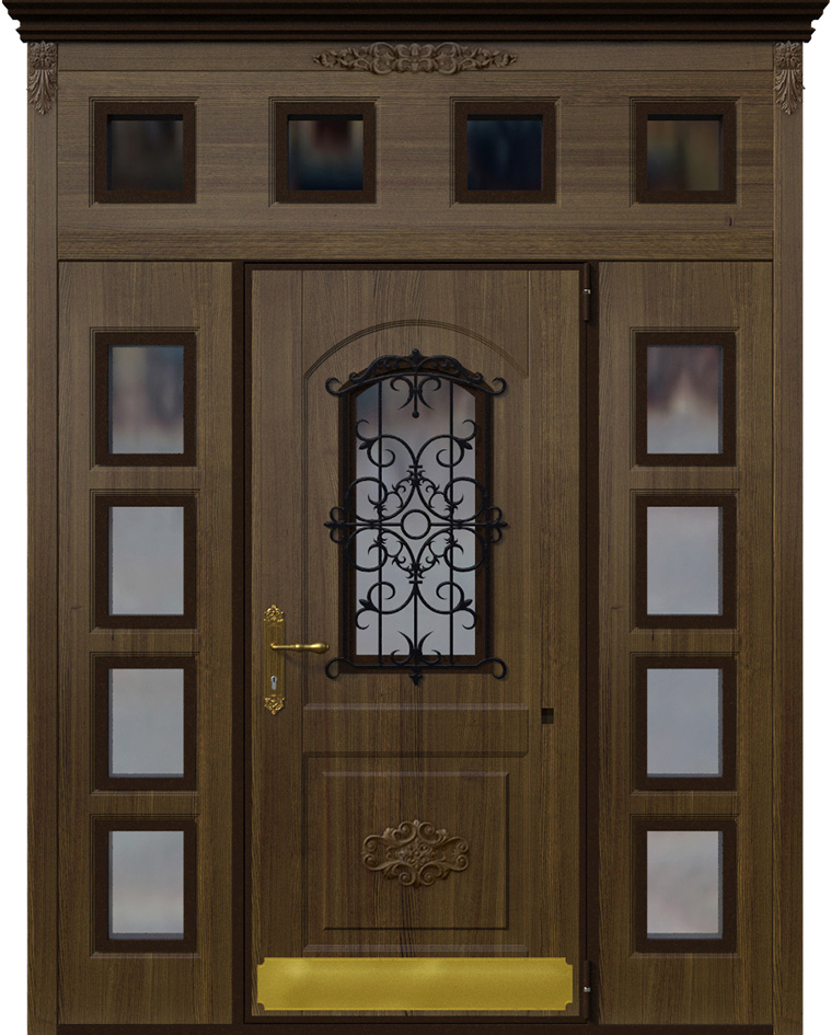 Эта модель выделяется своим масштабом и декоративностью: двухстворчатая дверь со вставками и ковкой №2 подчеркивает парадность входа и придает фасаду респектабельность. Основу составляет прочный каркас из стальных профильных труб с листом металла толщиной 2 мм и ребрами жесткости, что обеспечивает долговечность и защиту. Снаружи и внутри полотно облицовано накладками МДФ, которые позволяют воплотить различные варианты текстур и оттенков, сохраняя устойчивость к механическим повреждениям и влиянию внешней среды. Кованые элементы вносят в образ двери нотку изысканности и индивидуальности, делая ее центральным акцентом всего фасада. Для безопасности предусмотрены два замка турецкого производителя Kale Kilit — цилиндровый и сувальдный, каждый с ригелями, усиливающими защиту. Такая дверь сочетает надежность металлической конструкции с эстетикой классического дизайна, превращая вход в настоящий архитектурный акцент. Двухстворчатая дверь со вставками и ковкой №2 от производителя: быстрое изготовление и монтаж в Химках, индивидуальные размеры, широкий выбор материалов и фурнитуры, официальная гарантия до 10 лет.