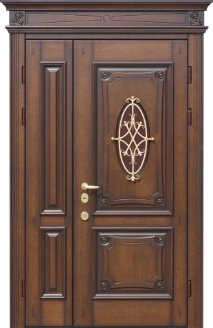 Дизайнерская входная дверь в частный дом с отделкой под дерево и решеткой №17